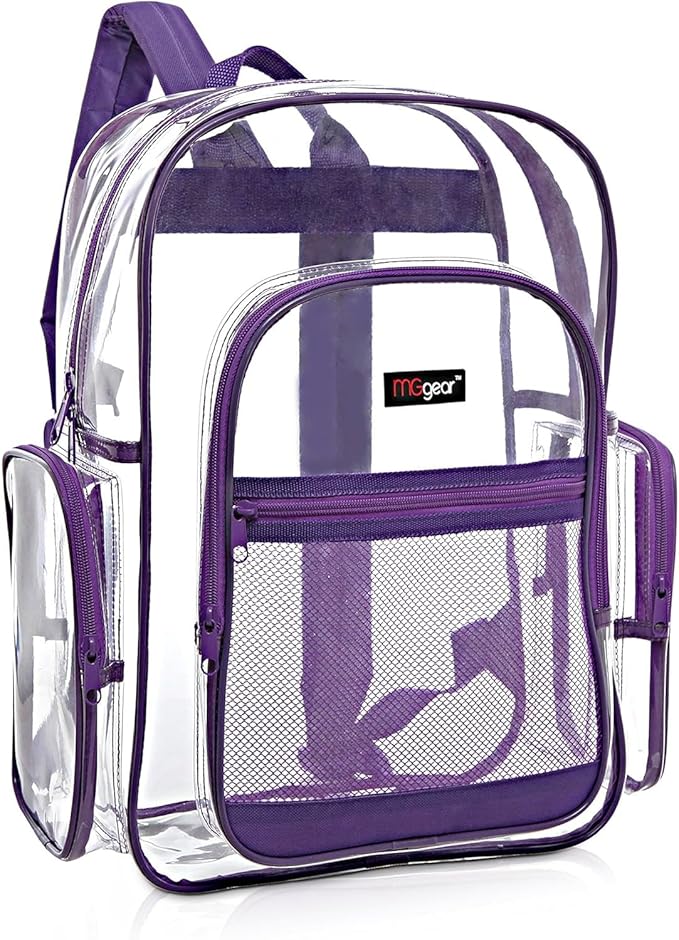 - School approved clear backpack with purple trim and 5 zipper compartments for kids and adults is perfect for events, work, or travel