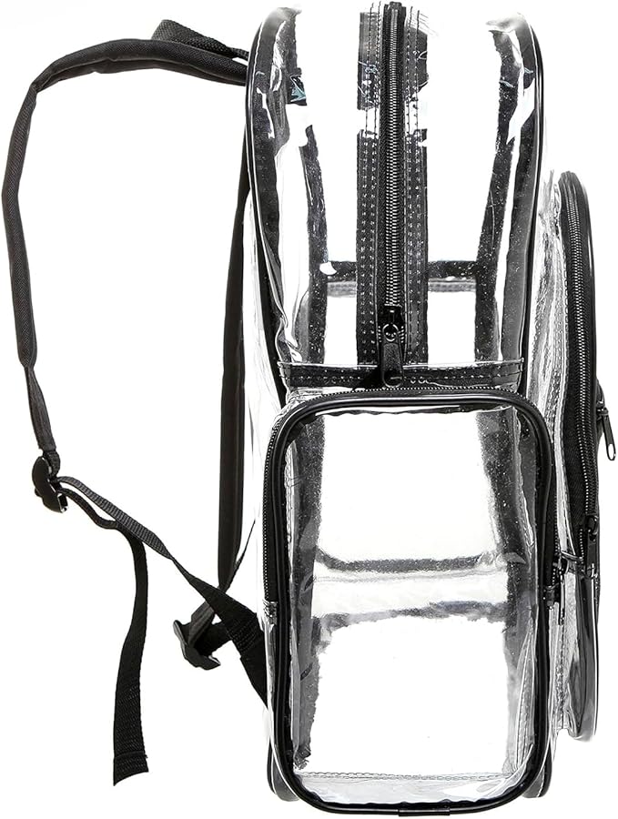 - 17-by-13-inch transparent PVC bookbag features a dual-zippered large capacity main storage compartment and 4 smaller accessory pockets