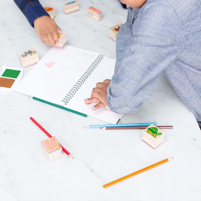 - Animal-themed deluxe wooden stamp set with washable ink pads and markers