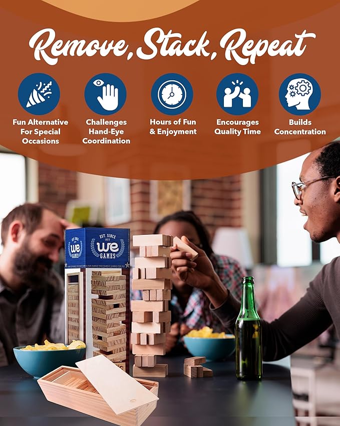 WE Games Wooden Block Stacking Party Game for Adults, Tumble Tower Wedding Guest Book Alternative, Tabletop Games, Includes Storage Case, 12 inches