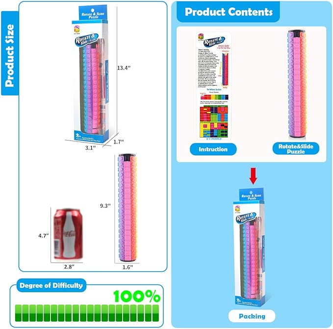 - 【 Uses 】Unlike other brain games,the patented,critically acclaimed cube puzzle is a unique toy and unique gift,it is a combination of rotating magic cube and slide puzzle,each puzzle piece can be rotated from up and down with a whole column around the axis as well as be slided left and right on a row