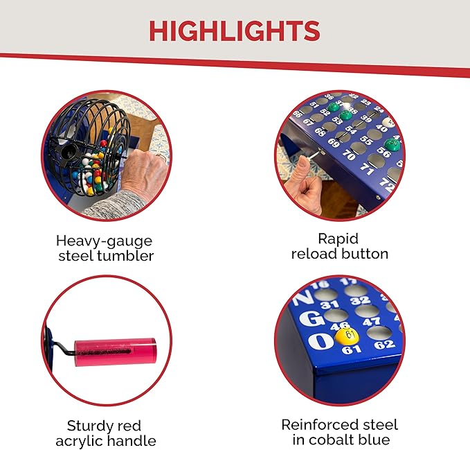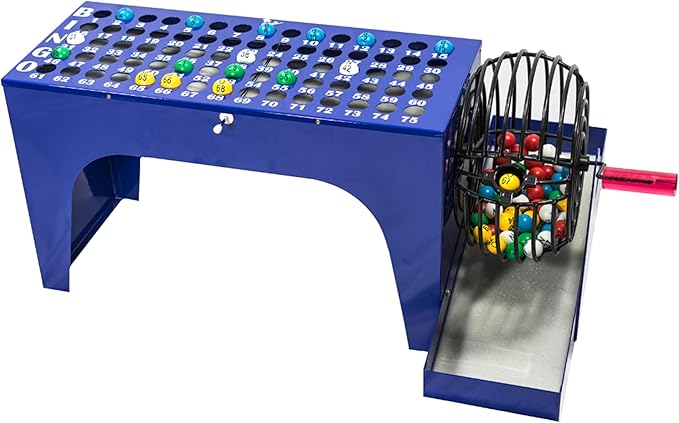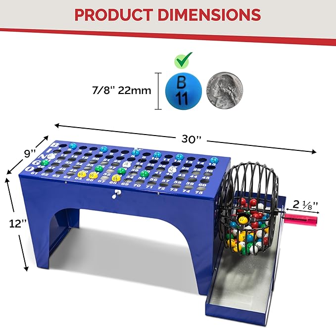 - ALL-IN-ONE PROFESSIONAL MANUAL BINGO MACHINE: Our premium tabletop bingo machine includes (75) 7/8 inch EASY READ bingo balls with built-in roll cage and bingo master board. Our professional bingo game is manufactured with heavy-gauge steel and expertly finished in a bright cobalt blue color with an attractive red acrylic handle; Overall item dimensions are 12" H X 16" W X 27" L.