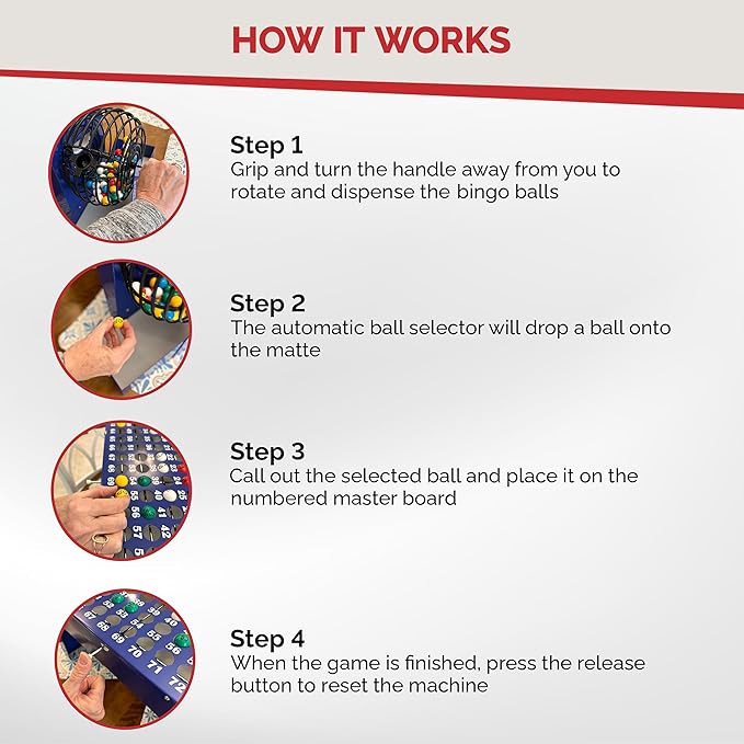 - GO HANDS-FREE: The alloy weighted ball selector cup included with our bingo set automatically selects balls without getting caught. The machine is fully assembled and ready to use right from the box. After each game is finished, simply store the bingo balls in the bingo ball cage (tumbler) in between games. No additional clean up is required.