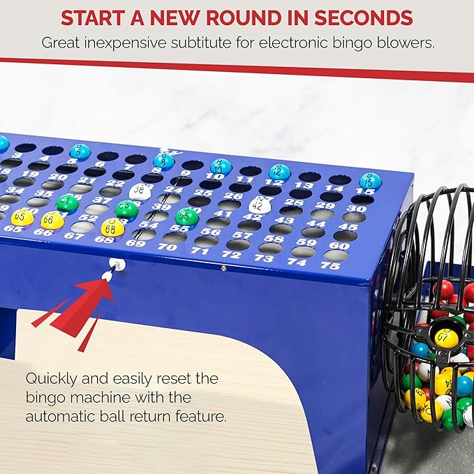 - MAKE QUICK RELOADS: This bingo game deluxe model is a convenient and inexpensive alternative to costly and bulky electronic bingo flashboards. The bingo caller will dispense a bingo ball from the bingo cage and call it out loud. For simple and efficient tracking, the bingo caller will place the called bingo ball on the corresponding number atop the master board panel. Quickly and easily reset the bingo machine with the automatic ball return feature.
