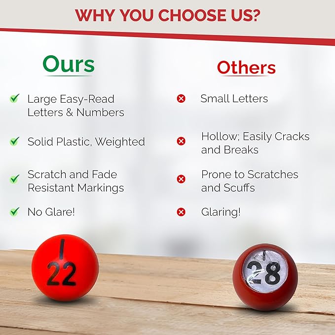 - NEW BINGO BALL TECHNOLOGY: Introducing NEW proprietary technology, our 7/8 Inch 5-color solid core plastic bingo balls are glare free, scratch resistant, and feature large EASY-READ letters and numbers that will NEVER rub off or fade. Our bingo balls with cage are a must-have for any bingo game!