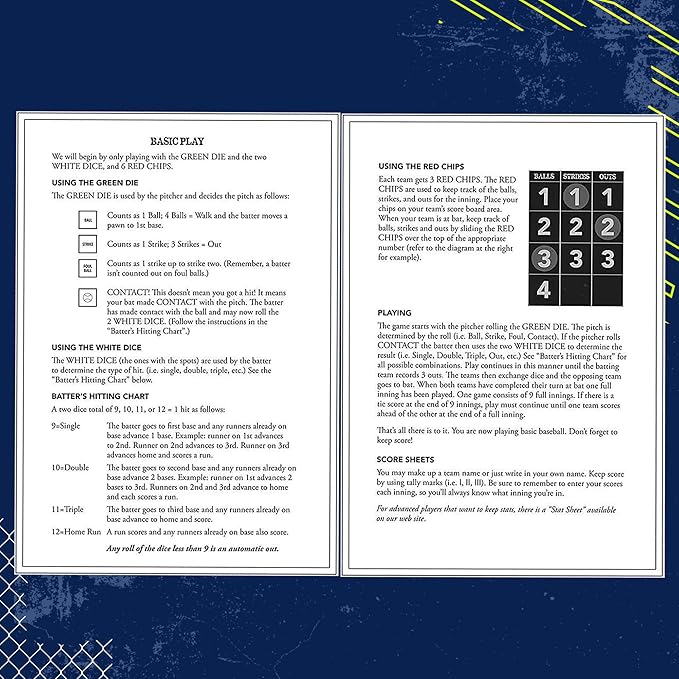 - It’s a Grand Slam Game - Our baseball board game for kids has everything you need for a simulated baseball game. It comes with 4 red and 4 blue tokens, 2 standard dice, 3 special dice, a game board, pencils, score pad, and a detailed rule book.