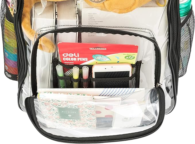 - Heavy Duty Rolling Clear Backpack with mesh organizer in front pocket & mesh pockets on both sides.
