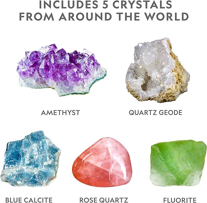 - INCLUDES REAL CRYSTAL SPECIMENS – Start or expand your rock collection! Comes with 5 real gemstone specimens: quartz, rose quartz, fluorite, calcite, and amethyst. Learn about the gemstones in the kit with the included, full-color Learning Guide.