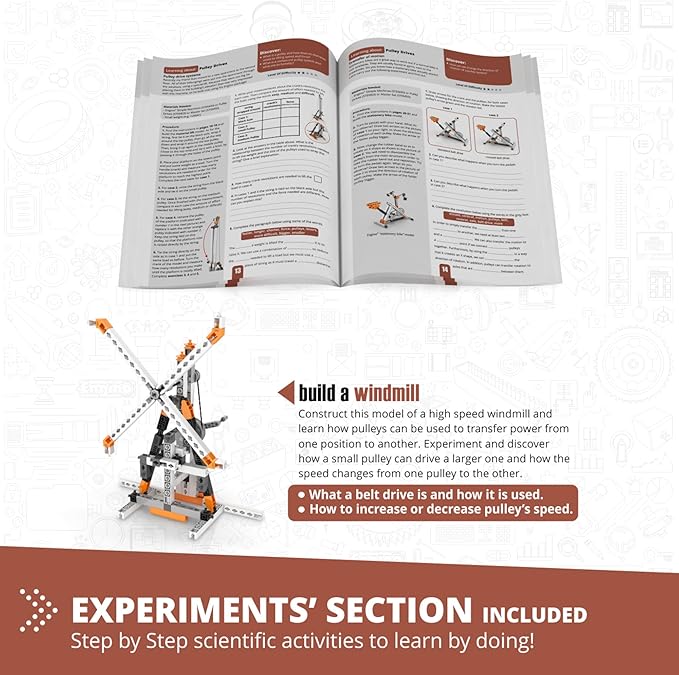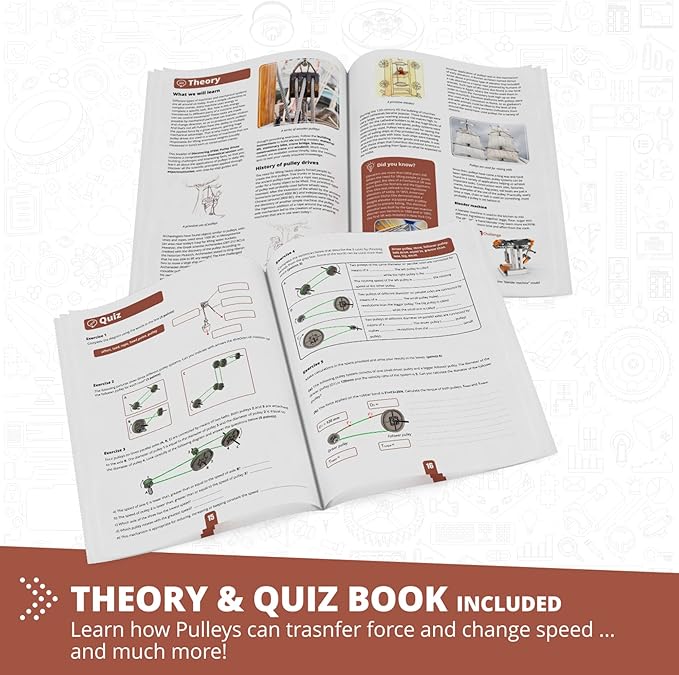 - EXPLORE PULLEYS: Kids discover the power of pulley drives with reduced friction, boosting force and speed! BUILD 8 working models like a material lift, a stationary bike, a construction crane and more.