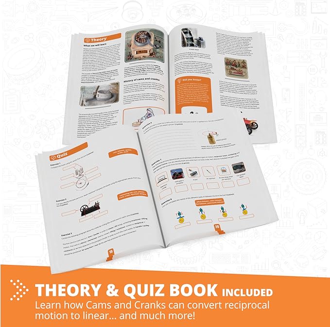- LEARN ABOUT MOTION: Kids explore power transmission using cams and cranks, converting linear motion into rotation. Build 8 working models, including a fishing crane, oil pump, flying eagle & more.