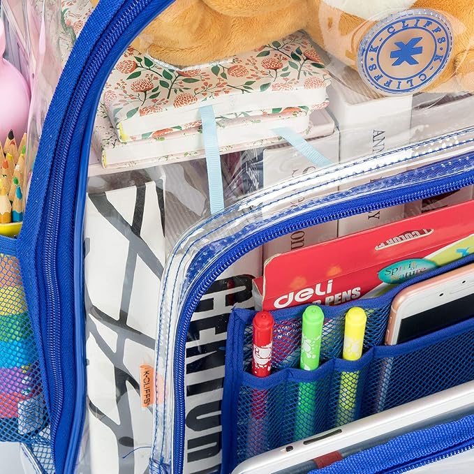 - Heavy Duty Clear Rolling Backpack with mesh organizer in front pocket & mesh pockets on both sides.