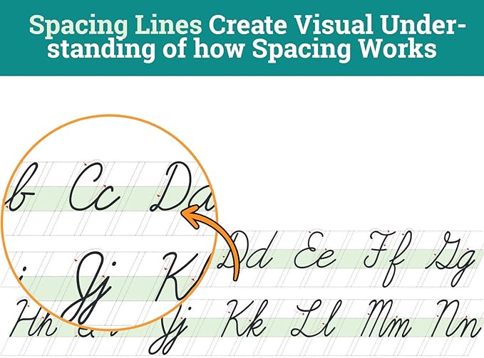 - CONSISTENT CALLIGRAPHY PRACTICE: Uniform slanted blank blocks aid consistent letter size; Slanted spacing lines guide proper spacing; Green shade helps maintain small case position and creates a guide for writing straight sentences to avoid landslide writing style
