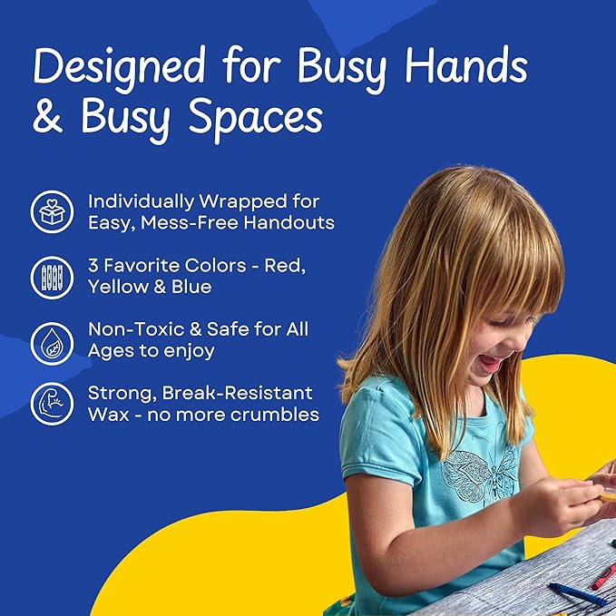 - Bulk Packaging: Comes in a 720 count case with 240 3-packs of red, yellow, and blue crayons.