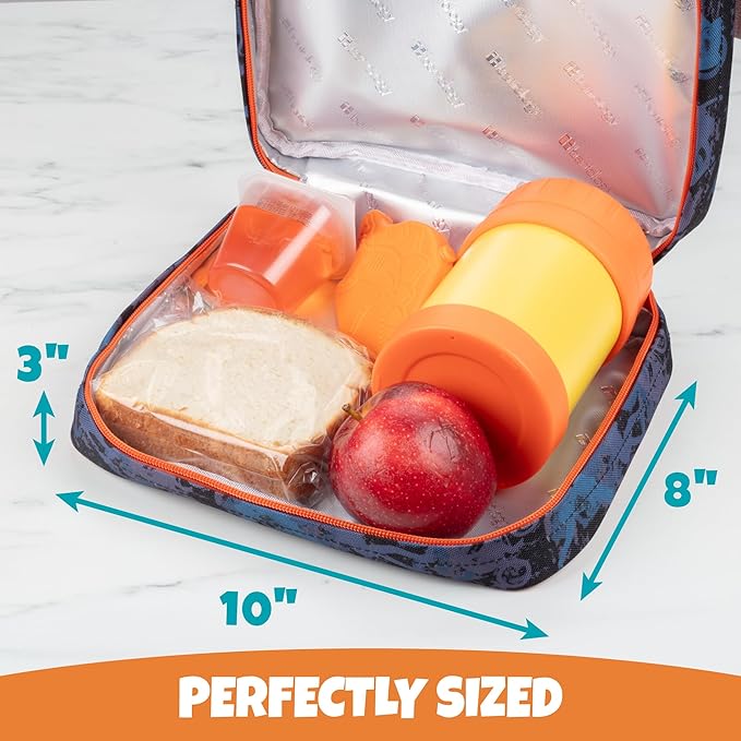 - PERFECTLY SIZED REUSABLE SPORTS LUNCHBOX: Great for Back to School, this lunch bag features a clip on handle for easy carrying! The slim design allows for easy storage without the bulk measuring 10 x 8 x 3 inches fits Bentology Bento Box containers, and is compatible with most kid Bento Box brands (sold separately). Food Safe - No Lead, BPA, Phthalates, Suitable for Ages 3+. THIS LISTING IS FOR BAG ONLY, ALL OTHER ACCESSORIES SHOWN NOT INCLUDED.