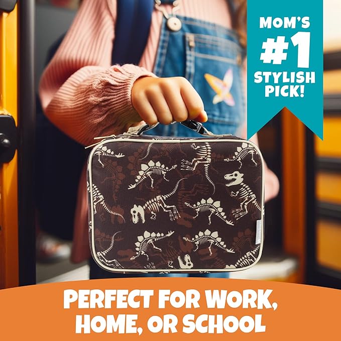 - PERFECTLY SIZED REUSABLE DINOSAUR LUNCHBOX: Great for Back to School, this cute lunch bag features a clip on handle for easy carrying! The slim design allows for easy storage without the bulk measuring 10 x 8 x 3 inches fits Bentology Bento Box containers, and is compatible with most kid Bento Box brands (sold separately). Food Safe - No Lead, BPA, Phthalates, Suitable for Ages 3+. THIS LISTING IS FOR BAG ONLY, ALL OTHER ACCESSORIES SHOWN NOT INCLUDED.