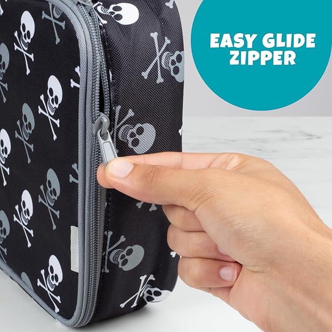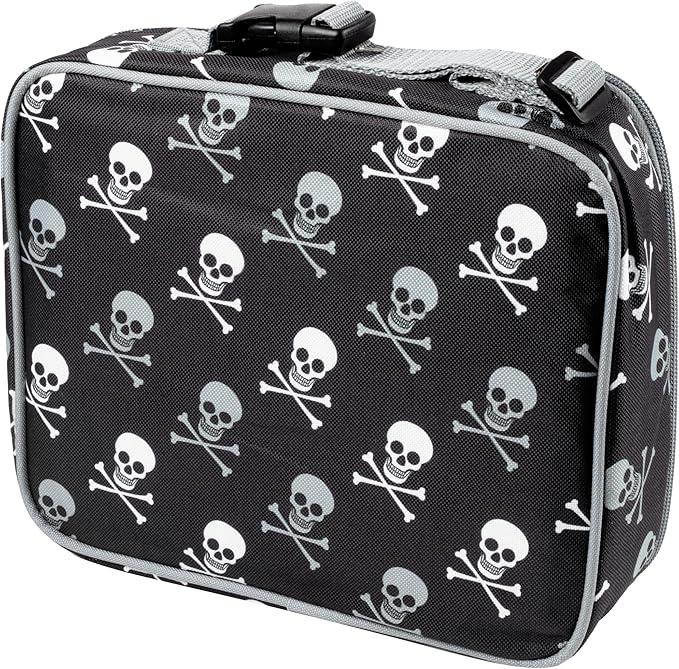 - PERFECTLY SIZED REUSABLE PIRATE SKULL & CROSSBONES LUNCHBOX: Great for Back to School, this lunch bag features a clip on handle for easy carrying! The slim design allows for easy storage without the bulk measuring 10 x 8 x 3 inches (measured from the outside) fits Bentology Bento Box containers, and is compatible with most kid Bento Box brands (sold separately). Food Safe - No Lead, BPA, Phthalates, Suitable for Ages 3+. THIS LISTING IS FOR BAG ONLY, ALL OTHER ACCESSORIES SHOWN NOT INCLUDED.