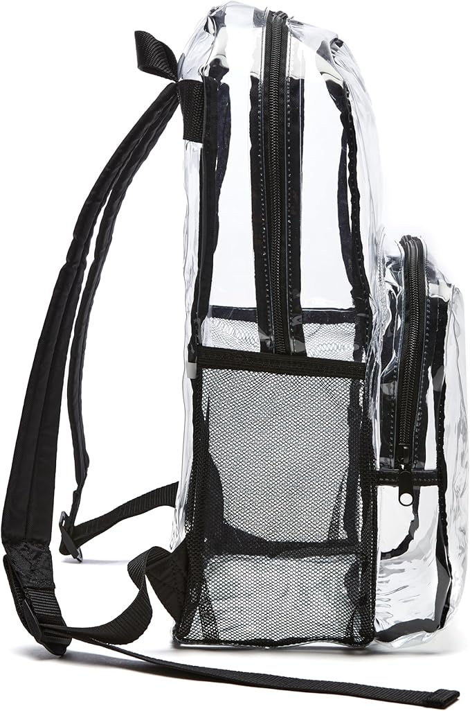 Amazon Basics Transparent School Backpack, With Water-Resistant PVC Plastic Material and Ruggedly Reinforced Shoulder Straps, Clear