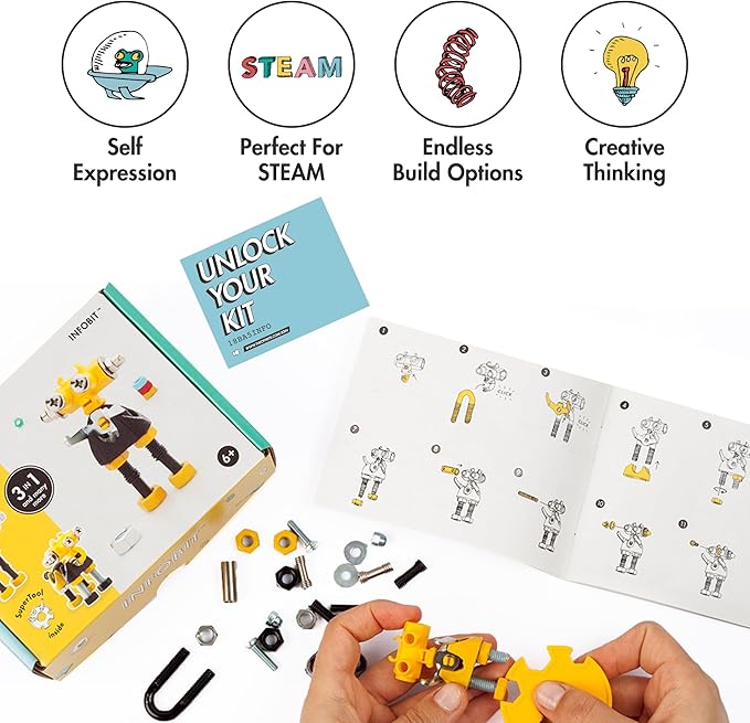 - Endless Creation with Real Nuts and Bolts: Build at least 3 out-of-the-box models with endless possibilities using the InfoBit to build a robot stem kit! Each robot building kit contains enough parts to build a single model at a time, ensuring a focused and engaging building experience while helping young minds grow in the fields of Science, Technology, Engineering, Arts, and Math.