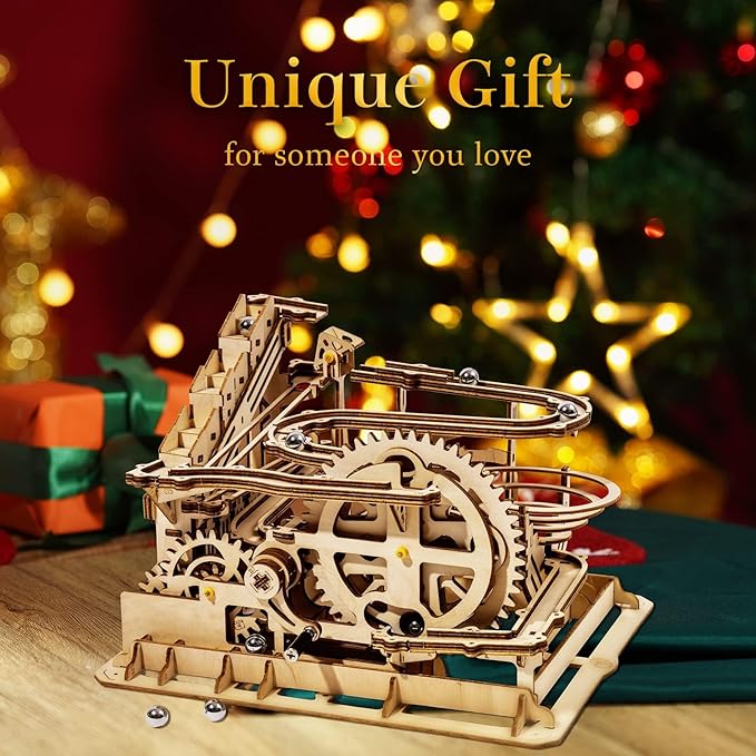 - 【Mechanical Gears】Build a 254pcs 3D wooden puzzle marble run set with big waterwheel lifter and funnel track. Full of gear trains, cams, ratchets and cranks. Loads of fun to rotate the handle and see marbles run crazy on different tracks!