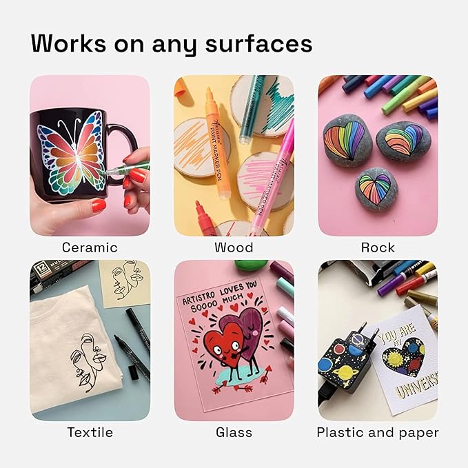 - Great for All Surfaces: Use these metallic paint pens as metallic fabric markers, metallic chalk pens, or metallic pens for glass. Metallic markers paint is good on almost all surfaces, like paper, rocks, stone, plastic, metal, wood, and more.