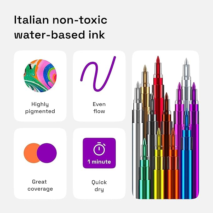 - Non-Toxic: Each metallic marker conforms to ASTM D-4236 standards. This metallic marker set is perfect for pros and beginners. Kids and adults will enjoy these drawing pens metallic. Metallic markers are a great gift for any artist. Great creative with Artistro today!