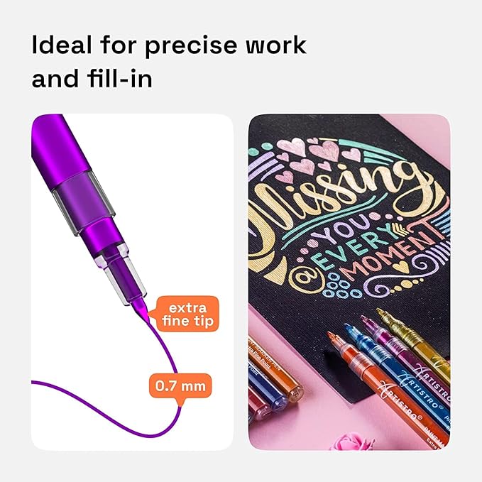 - 0.7mm Tip for Detailing: Make details with metallic marker pens fine point. Use the black paint pen or color metallic paint pens fine for outlines, lettering, and adding labels. Fine metalic markers are easy to activate.