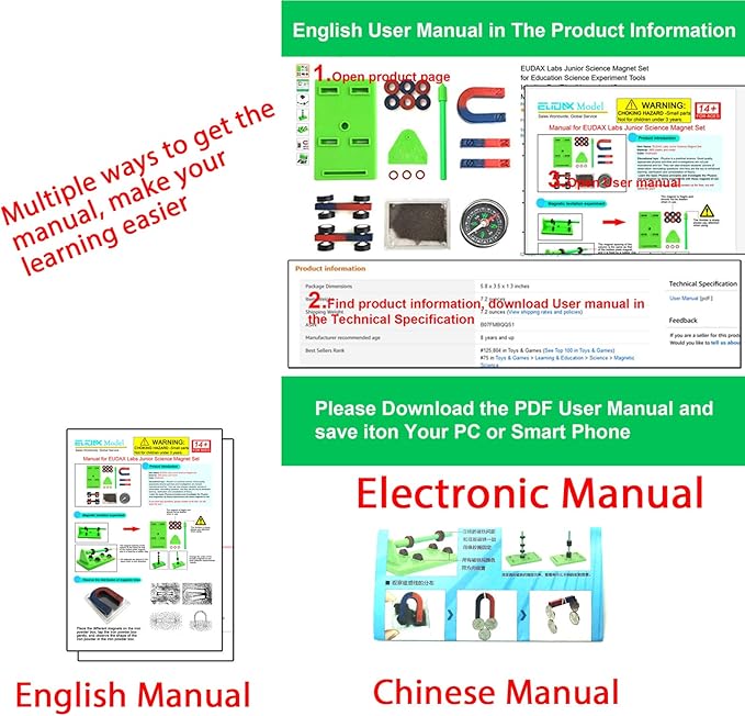 EUDAX Labs Junior Science Magnet Set for Education Science Experiment Tools Icluding Bar/Ring/Horseshoe/Compass Magnets