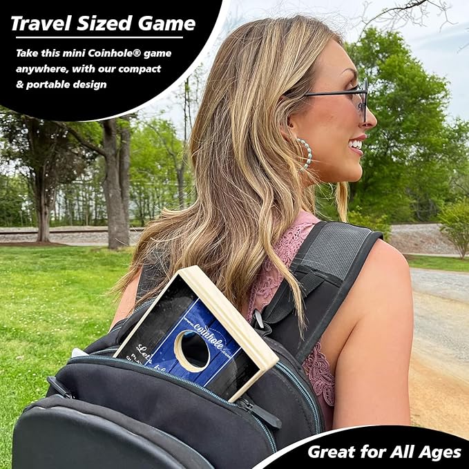 - Compact & Portable Design: Enjoy the classic game of cornhole in a new, miniature, portable cornhole set, official tabletop game size. Includes 1 wooden game board, 2 Coinhole Coins 1 Gold, 1 Silver, sticker and instructions, in a gift box.