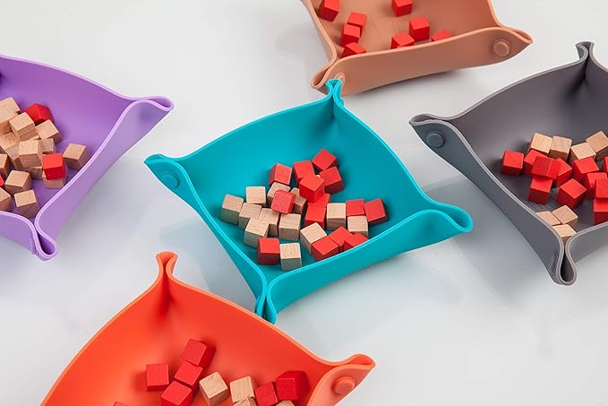 - [THE RIGHT SORT & WIDE APPLICATIONS] Organize your board game chits in five handy, portable dishes for easy access and sorting. The foldable dice tray have enough space which not only can hold your polyhedral dice while DND game, but also can be applied to hold many items, such as watches, jewelry, keys, coins, and candies etc.