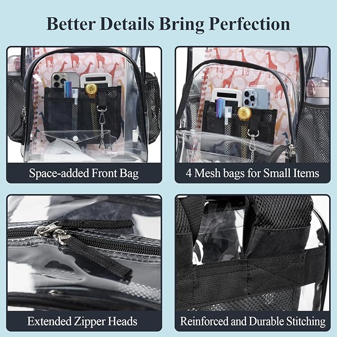 - Built to Last: This heavy duty clear backpack is made from thick, high-quality PVC with reinforced stitching, sturdy zippers, and a reinforced fabric bottom. It withstands daily wear and tear, saving you from frequent replacements and ensuring long-lasting use.