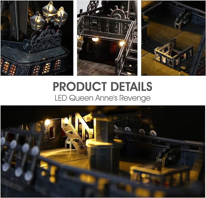 - EMBARK ON A PIRATE ADVENTURE: Set sail with our 3D Queen Anne’s Revenge Puzzle. This pirate ship model, standing an impressive 25.2 inches tall and made up of 340 pieces, becomes a thrilling adventure, especially with 15 warm LED lights that bring it to life at night. You’d never guess it's made from foam board - it's a striking addition to any collection
