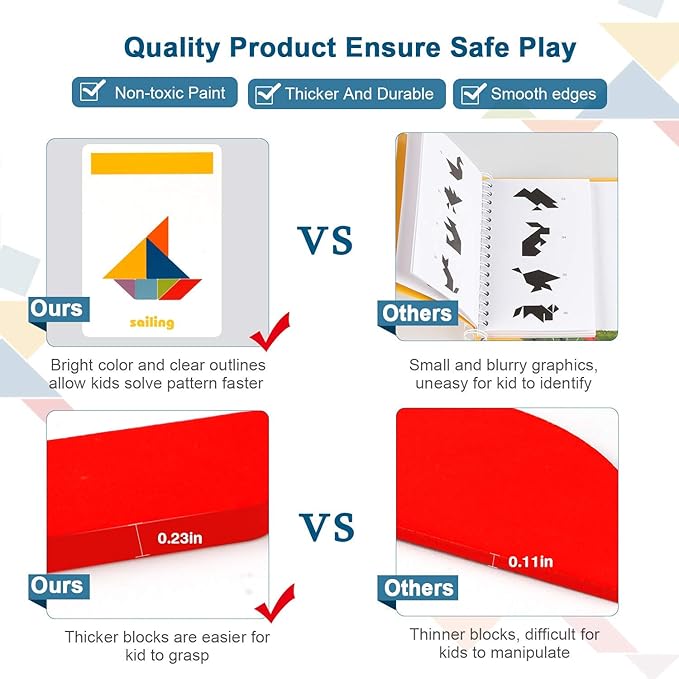 - Safety Wooden Materials: Pattern Blocks puzzles are made of natural wood. Wooden pieces are coated with bright colored &non-toxic water paint and up to US safety standard. The pieces are well sanded, no chemical smell. All the pieces are specially designed to perfectly sized for tiny hands that ensures your little ones to hold properly.