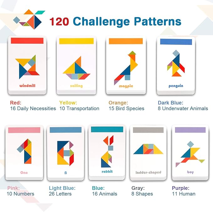 - Creative Educational Jigsaw Toy: The tangram is a dissection puzzle consisting of seven flat shapes, called tans, which are put together to form shapes. The Pattern block sets contains 7 wooden pieces and 60 double-sided pattern cards including animals, vehicles, Letters, Numbers etc. kids can try to build what is shown on the cards or create their own designs, great for developing spatial awareness, color & shape recognition, hand-eye coordination, and problem-solving!