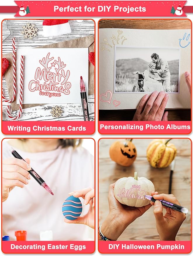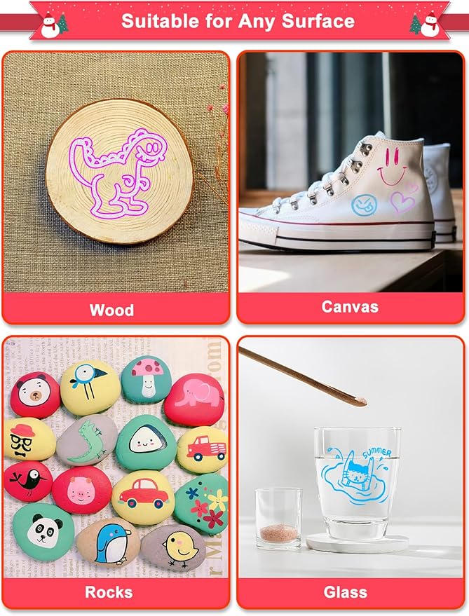 - ✔ MULTI-SURFACE USE – Use these colored pens on paper, canvas, wood, fabric, plastic, metal, glass, ceramic, stones, rubber, and more. Ideal for decorating holiday cards, scrapbooks, albums, envelopes, gift boxes, and party decorations. Create unique, festive touches for Halloween, birthdays, and other celebrations!