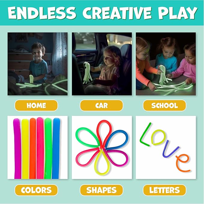 - Glow In The Dark Stretchy Strings - The ultimate sensory toys that provide fun and entertainment for both kids and adults. A great addition to any calm down corner or quiet time setup. The vibrant colors offer engaging visual stimulation and an incredible glow in the dark—just hold them up to a light source for 60 seconds and watch them shine!