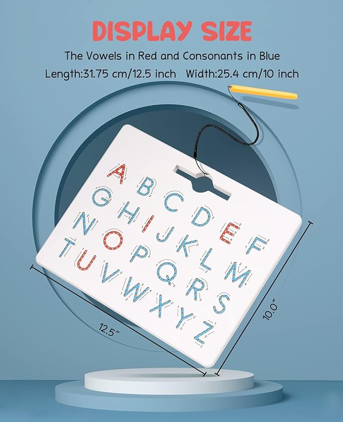 - 2 Sided Letter Tracing Board: Upper case on one side and Lower case on the other side. The vowels in red and consonants in blue are convenient for children to learn pronunciation and grammar