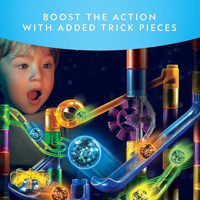 - GLOW IN THE DARK MARBLES – add 5 new glow in the dark glass marbles to your collection and watch them shine bright as they zig-zag down the marble run.
