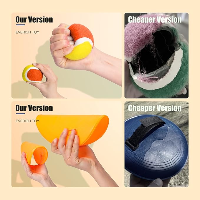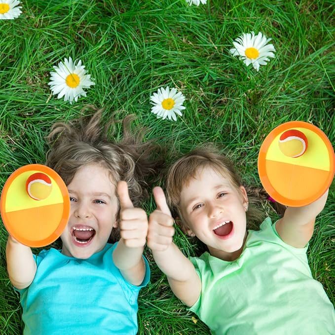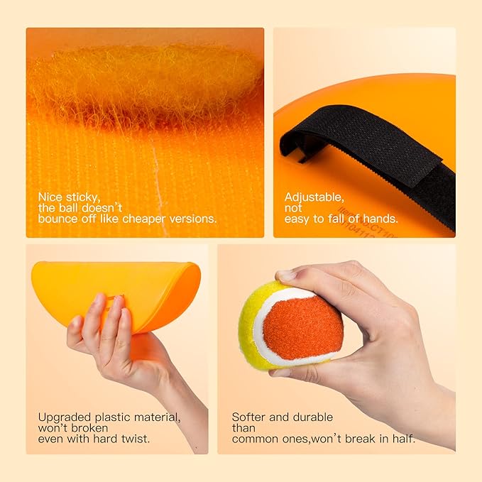 - 【Softer and High-quality Ball Set】The old version's tennis balls were very hard and lacked elasticity, making them difficult for kids to catch. Our balls are much stronger and softer, yet still have great stickiness, so kids can easily catch them and enjoy a comfortable feel. Kids won't lose their fun because they can keep catching the ball. This ball game is always lots of fun for little ones, even at family reunions.