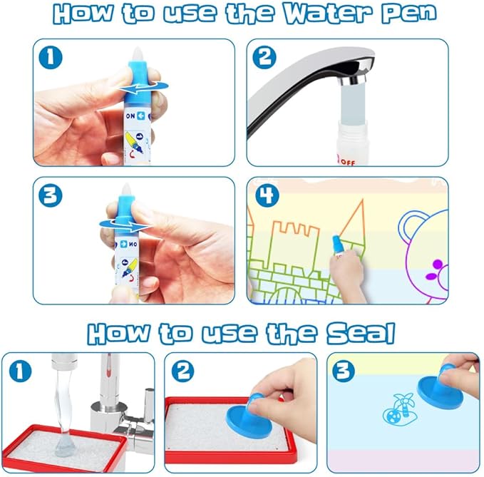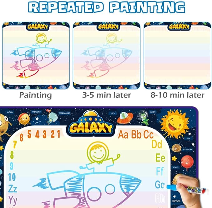 - Reusable Water Doodle Mat -- Fill the magic pen with clean water and draw on the magic drawing mat. After 3-10 minutes, it magically disappears. Kid can doodle on it over and over again. Save papers, save trees, save environment.