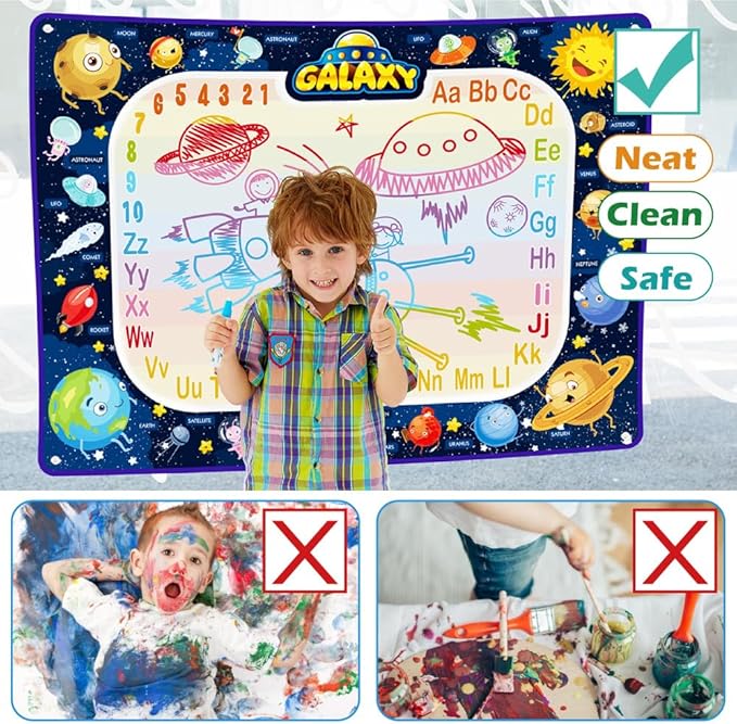 - Safe, No Mess, Easy to Use -- No paint, Non-toxic, Non-polluting. No mess with water proof backing. No paint or ink, simply draw with water on the aqua mat. Perfect Birthday Christmas Gifts Toys for 3 4 5 6 7 8 year old girls boys