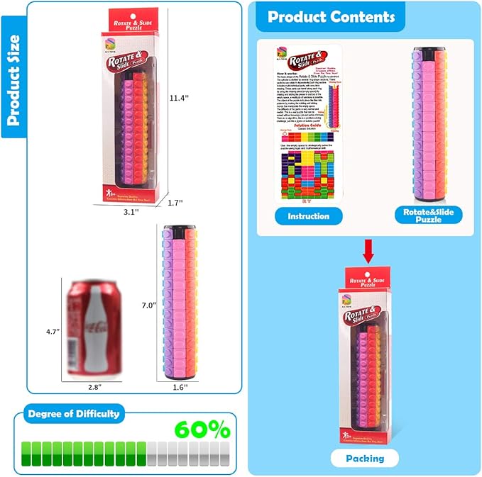 - 【 Uses 】Unlike other brain games,the patented,critically acclaimed cube puzzle is a unique toy and unique gift,it is a combination of rotating magic cube and slide puzzle,each puzzle piece can be rotated from up and down with a whole column around the axis as well as be slided left and right on a row
