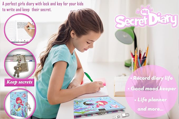GINMLYDA Girls Diary with Lock for Kids, Mermaid Diaries 7.1x5.3 160 Pages Cute Girl Journal Secret Notebook with Lock and Key for Little Kid Writing Drawing Gift for Pre school Age 6,8,12