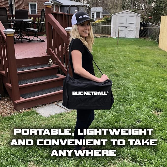 - PORTABLE! LIGHTWEIGHT! CONVENIENT! BucketBall is portable, lightweight and convenient to take anywhere on the go. The BucketBall Party Pack weighs less than 10 pounds. When BucketBall is setup for game play, it is just as large as cornhole. However, when BucketBall is packaged inside it's tote bag, it takes up less than a cubic foot of space.