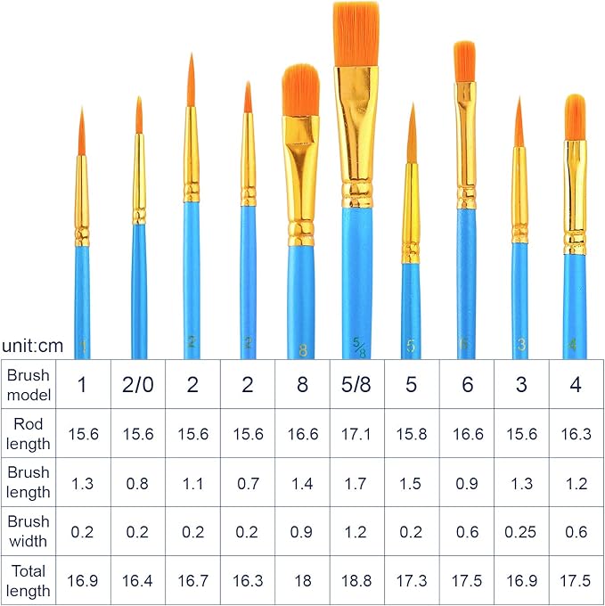 - 10 PREMIUM BRUSHES INCLUDED: 10 multi-functional brushes with different sizes, round & flat tips for detailing and broad strokes. Durable, splatter-resistant bristles for smooth application. You can use the brush to describe the details of your paintings