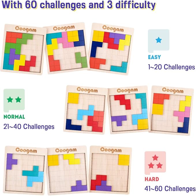 Coogam Wooden Puzzle Pattern Blocks Brain Teasers Game with 60 Challenges, 3D Russian Building Toy Wood Tangram Shape Jigsaw Puzzles Montessori STEM Educational Toys Gift for Kids Adults