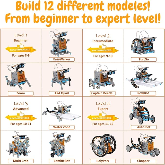 - ✔️[INSPIRE A LOVE FOR KIDS SCIENCE EXPERIMENTS]: Technology, engineering, and math by building their own 12 unique robots. stem projects- Every solar kids stem robot science kit comes with a guide for 12 robots. easy-to-follow, step-by-step, from level 1-Adv to level 2-Pro. If it seems at first, that your child has difficulty assembling - it is important that you encourage him to follow the assembly instructions that will help him meet the challenge and succeed in the assembly project.