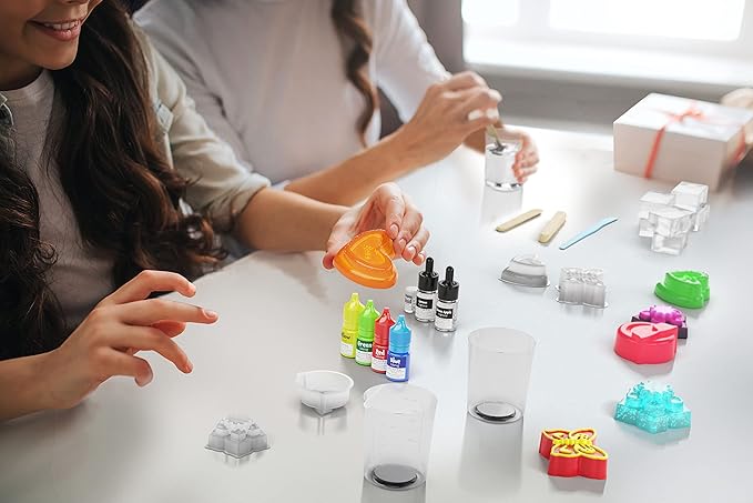 - Kit Includes: 8 soap-base blocks, 2 fragrances (green apple and lemon), 4 liquid colors (red, blue, yellow, green), glitter, 4 molds, 4 beakers, 8 pop sticks, removal tool, and comprehensive instruction guide.