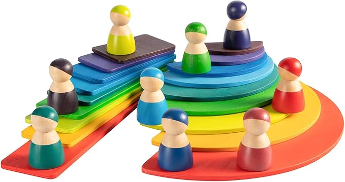- 【Fun Play】 These rainbow peg doll are very durable, combine the rainbow stacker, rainbow balls and rainbow building board to pretend to be a wooden little people, walk through the castle, through the rainbow tunnel, and board the rainbow bridge