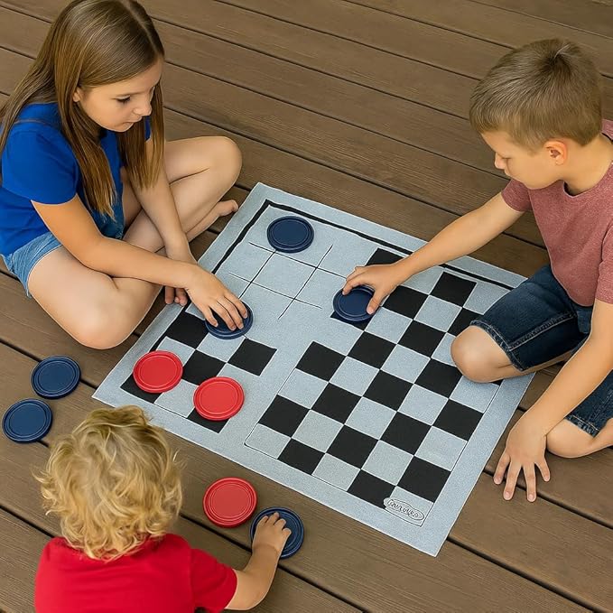 - DOUBLE-SIDED EXCITEMENT: Flip for Giant Tic-Tac-Toe, Mega Tic-Tac-Toe, or a Giant Checkerboard—cool board game versatility