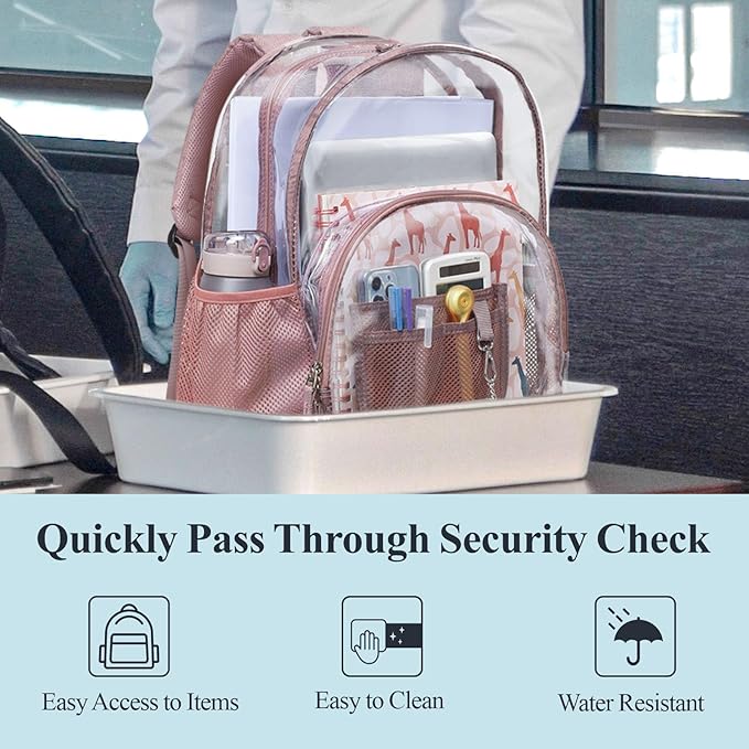 - Spacious and Organized: This large clear backpack measures 12.6" x 6.7" x 17.1", offering ample space for binders, laptop, notebooks, and more. With 1 main compartment, 1 front zipper pocket with mesh slots, and 2 side pockets for a water bottle and umbrella, it keeps your school essentials neatly organized and easily accessible.